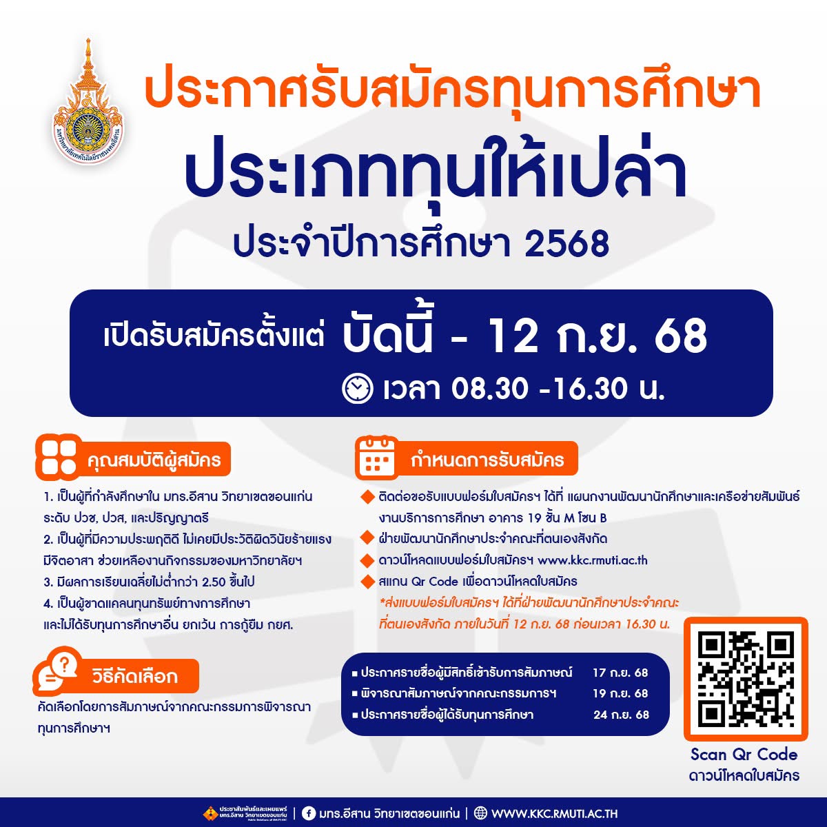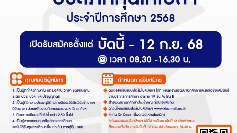 1. āļœāļđāđ‰āļŠāļĄāļąāļ„āļĢāļ‚āļ­āļĢāļąāļšāļ—āļļāļ™āļāļēāļĢāļĻāļķāļāļĐāļēāļŠāļēāļĄāļēāļĢāļ–āļ”āļēāļ§āļ™āđŒāđ‚āļŦāļĨāļ”āđāļšāļšāļŸāļ­āļĢāđŒāļĄāđƒāļšāļŠāļĄāļąāļ„āļĢāļ‚āļ­āļĢāļąāļšāļ—āļļāļ™āļāļēāļĢāļĻāļķāļāļĐāļēāđ„āļ”āđ‰āļ—āļēāļ‡ www.kkc.rmuti.ac.th āļŦāļĢāļ·āļ­āļŠāđāļāļ™ QR-Code āļ”āđ‰āļēāļ™āļĨāđˆāļēāļ‡āļ™āļĩāđ‰ āđāļĨāļ°āļ•āļīāļ”āļ•āđˆāļ­āļ‚āļ­āļĢāļąāļšāđāļšāļšāļŸāļ­āļĢāđŒāļĄāđƒāļšāļŠāļĄāļąāļ„āļĢāļŊāđ„āļ”āđ‰āļ—āļĩāđˆāđāļœāļ™āļāļ‡āļēāļ™āļžāļąāļ’āļ™āļēāļ™āļąāļāļĻāļķāļāļĐāļēāđāļĨāļ°āđ€āļ„āļĢāļ·āļ­āļ‚āđˆāļēāļĒāļŠāļąāļĄāļžāļąāļ™āļ˜āđŒ āļ‡āļēāļ™āļšāļĢāļīāļāļēāļĢāļāļēāļĢāļĻāļķāļāļĐāļē āļ­āļēāļ„āļēāļĢ 19 āļŠāļąāđ‰āļ™ M āđ‚āļ‹āļ™ B āļŦāļĢāļ·āļ­āļāđˆāļēāļĒāļžāļąāļ’āļ™āļēāļ™āļąāļāļĻāļķāļāļĐāļēāļ›āļĢāļ°āļˆāļģāļ„āļ“āļ°āļ—āļĩāđˆāļ•āļ™āļŠāļąāļ‡āļāļąāļ” āļ•āļąāđ‰āļ‡āđāļ•āđˆāļšāļąāļ”āļ™āļĩāđ‰āļˆāļ™āļ–āļķāļ‡ āļ§āļąāļ™āļ—āļĩāđˆ 12 āļāļąāļ™āļĒāļēāļĒāļ™ 2568 āđ€āļ§āđ‰āļ™āļ§āļąāļ™āļŦāļĒāļļāļ”āļĢāļēāļŠāļāļēāļĢ āļ āļēāļ„āđ€āļŠāđ‰āļēāđ€āļ§āļĨāļē 8.30 āļ™. – 12.00 āļ™. āļ āļēāļ„āļšāđˆāļēāļĒāđ€āļ§āļĨāļē 13.00 āļ™. – 16.30 āļ™.